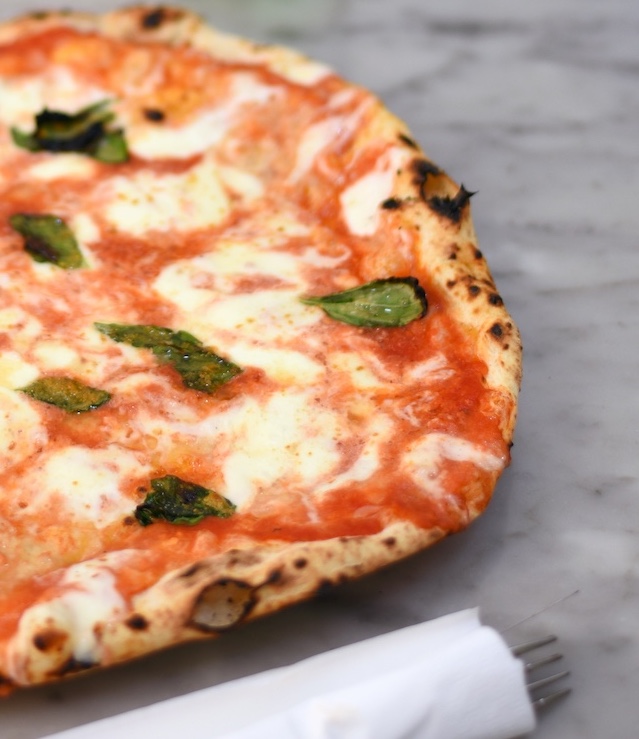 Baking: The pizza is baked in a wood-fired oven at around 485°C (905°F) for about 90 seconds. The intense heat ensures a crispy, slightly charred crust while keeping the toppings fresh and flavorful.